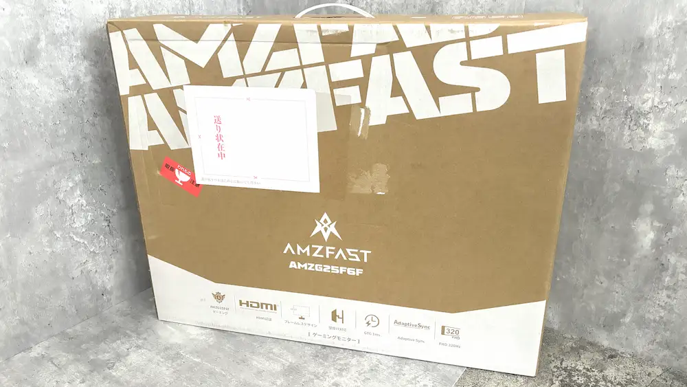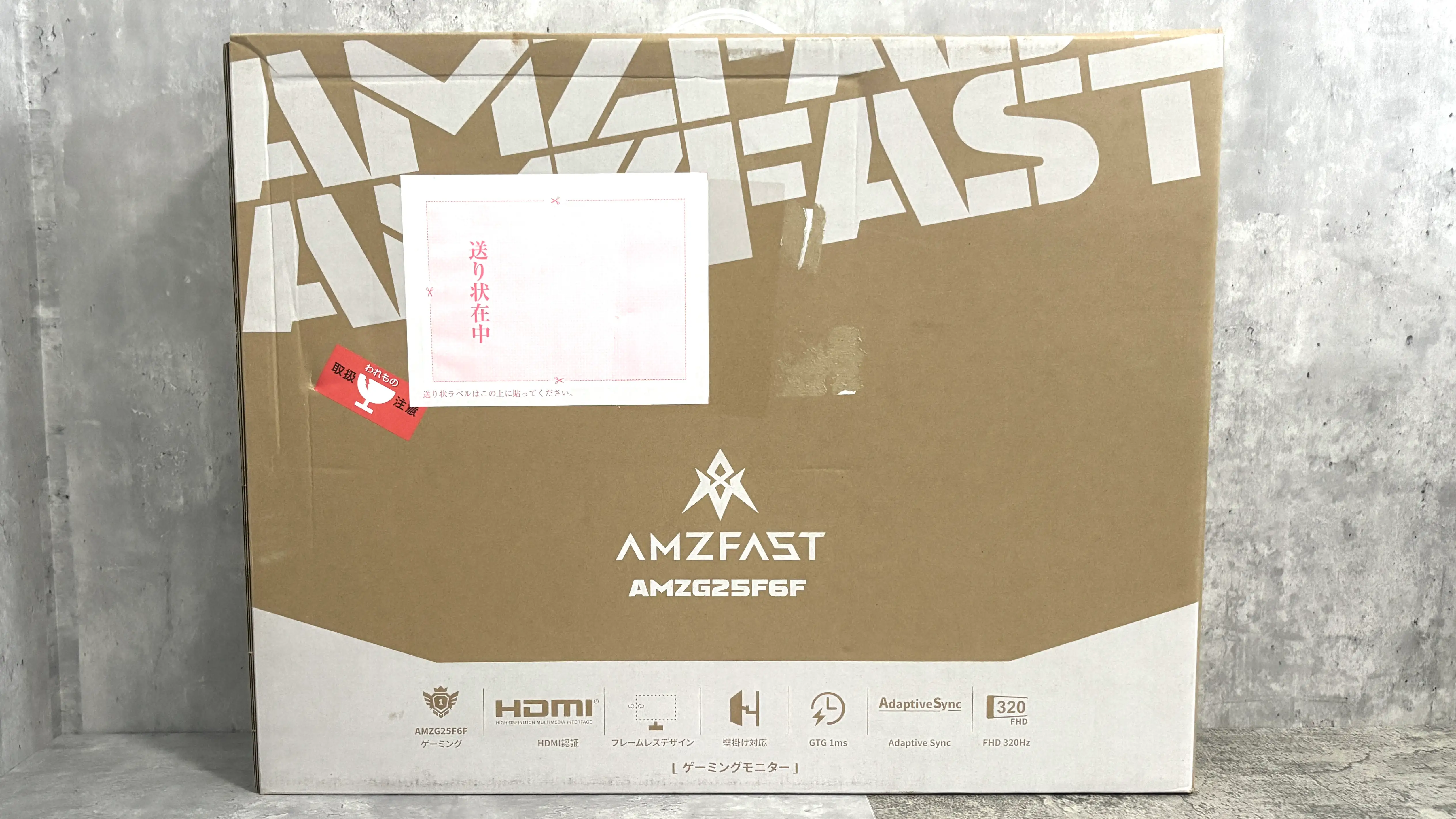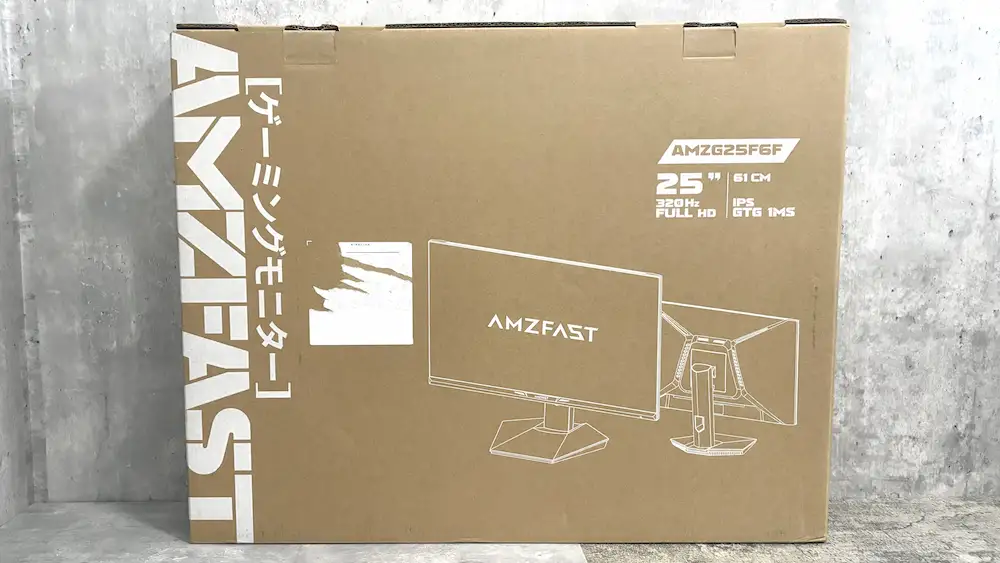 AMZG25F6Fは上画像のように専用の箱に梱包されて、届きました。箱には製品名やスペックが記載されています。ここも日本語なので、かなり日本を意識して作られたゲーミングモニターだなと思います。