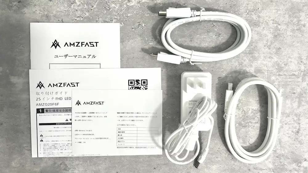 AMZG25F6Fの本体カラーに合わせた白で統一された付属品となっております。HDMIケーブルとDPケーブルが付属してるので、別で購入する必要はないと思います。説明書も付属しており、日本語なので読みやしいです。