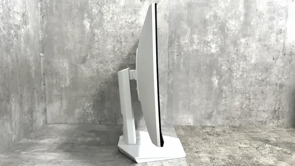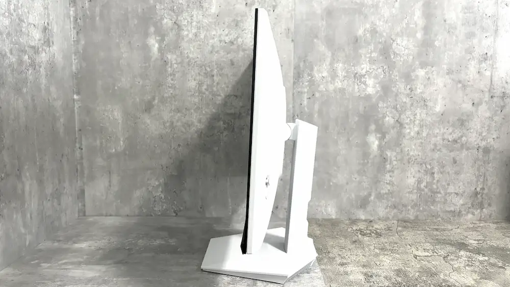 AMZG25F6Fは真横から見ても無駄のないシンプルなデザインで、スタンドを含めた奥行きが22cmとなっております。筐体はホワイト仕上げなので、圧迫感が少なく、側面の厚みも抑えられているためデスク上がすっきりと見える印象です。奥行きが22cmほどあるので、気になる方はモニターアームを別で用意するのが良いでしょう。
