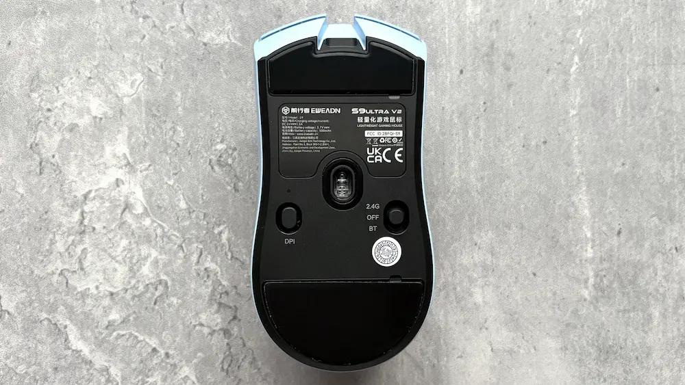 EWEADN S9V2 Ultraの背面には電源スイッチがあり、2.4GHz無線・Bluetoothの2パターンでの接続が可能。DPI切替スイッチも付いておりますので、マウス本体で切替ができます。
