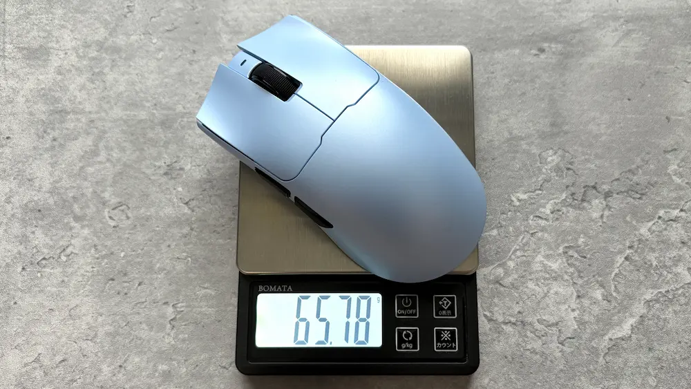 公式重量は61±4gとなっており、実際に計測してみると、65.78gという結果でした。65gは特に重たさも感じず、使いやすい重量だと思います。最近はもっと軽いマウスが増えてますが、全然使いやすい重量だと思います。