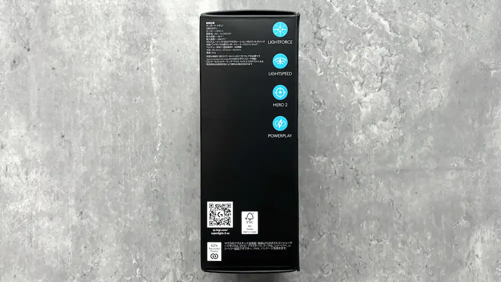 SUPERLIGHT 2 SEはいつものロジクールデザインの箱に入っています。箱には内容物やスペックなどが記載されています。