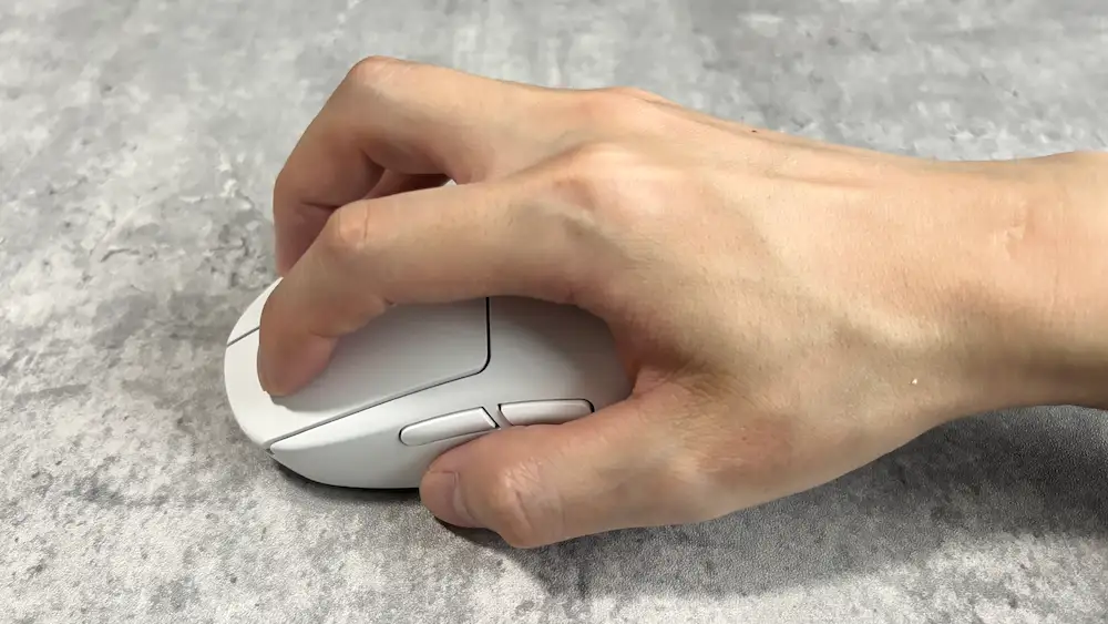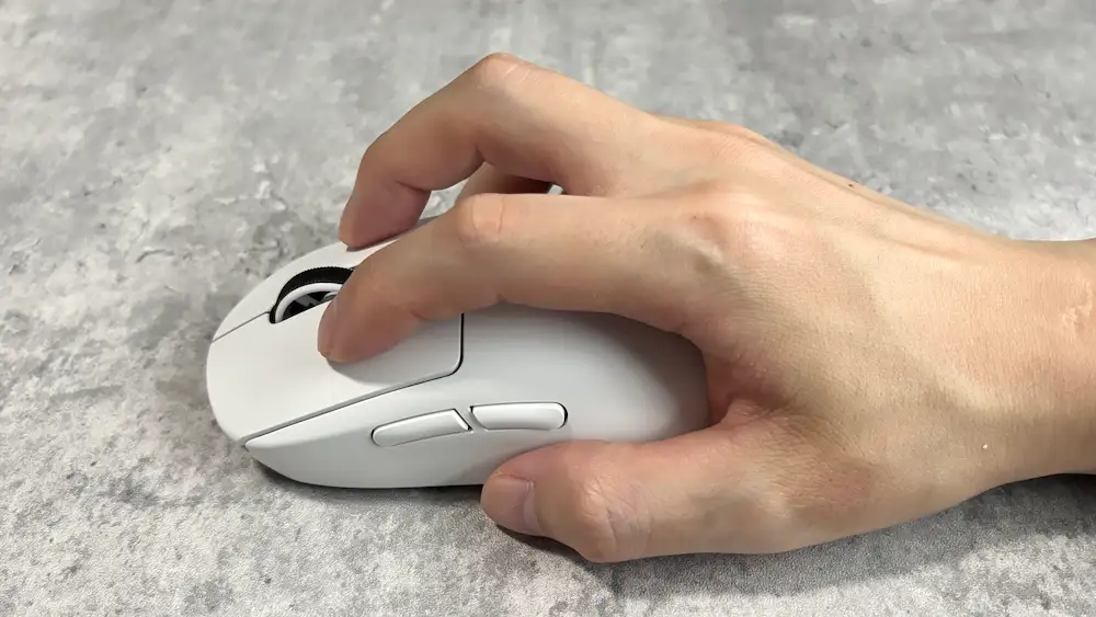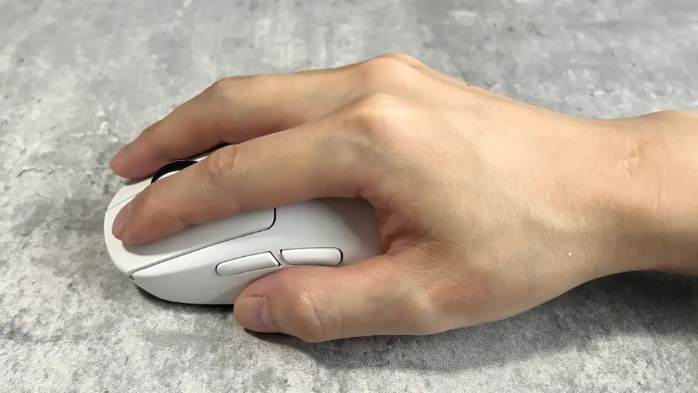 SUPERLIGHT 2 SEの形状は左右対称の王道シェイプ。初代SUPERLIGHTと同様の握り心地です。中型サイズながら手に馴染みやすく、かぶせ持ちからつまみ持ちまで幅広く対応。クセがなく移行もスムーズで、FPSでも直感的なエイムがしやすい印象でした。