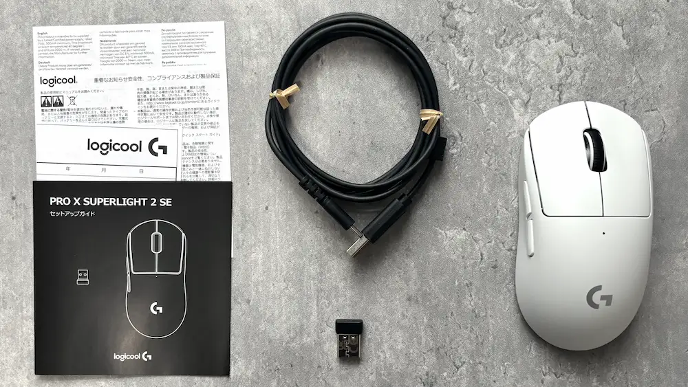 SUPERLIGHT 2 SEの内容物は結構シンプルです。マウス本体とレシーバーとケーブル。後は説明書類になっております。安いモデルなので、グリップテープやソール付きの裏蓋などは付属しておりません。とはいえ、そこまで重要なポイントではないと思います。