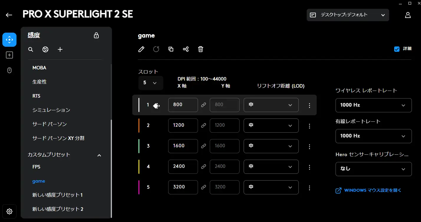 まずはSUPERLIGHT 2 SEの感度です。プリセットも用意されていますが、独自でカスタマイズもできます。