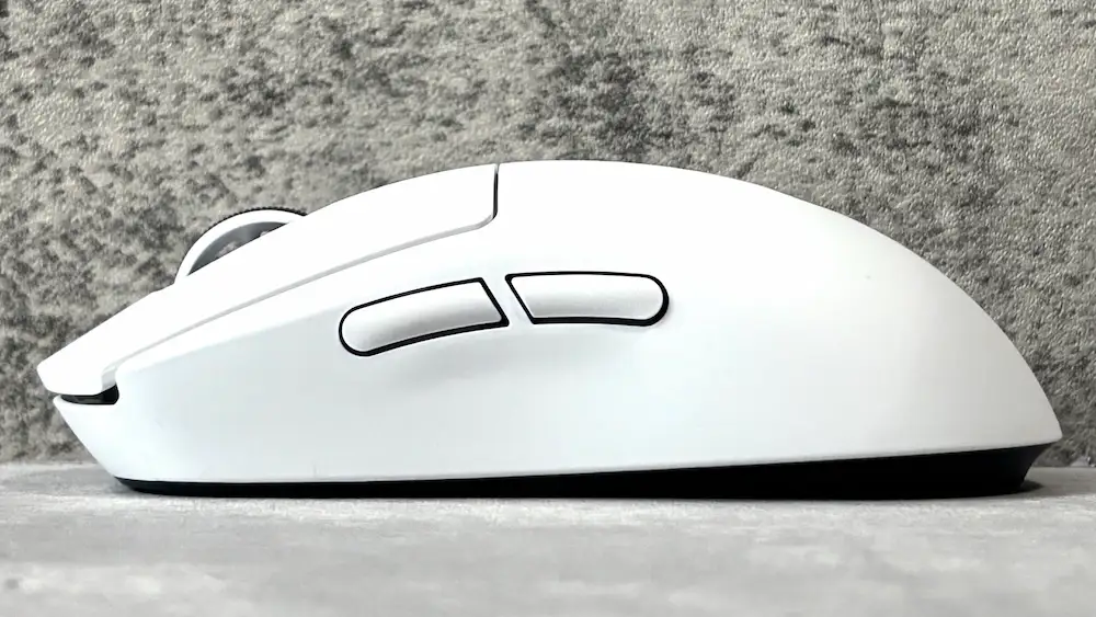 SUPERLIGHT 2 SEのサイドボタンは左側に2つ配置され、しっかりした深めの押し込みが特徴。従来のSUPERLIGHT 2シリーズよりムニっとした感触が強く、誤操作しにくい一方で素早く連打したい人にはやや重たく感じるかもしれません。