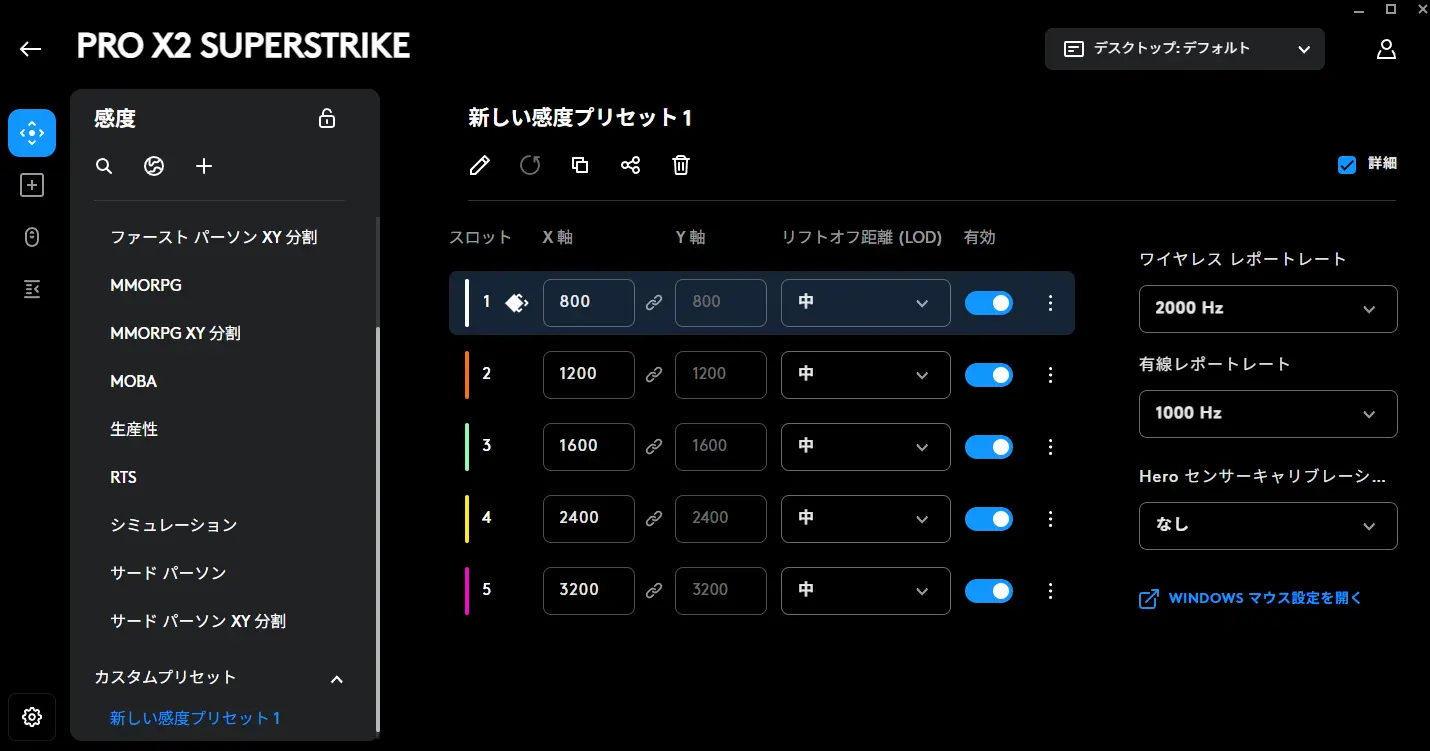 SUPERSTRIKEはSUPERLIGHT 2シリーズと同じHERO 2センサーを搭載。最大44,000DPIと安定したトラッキング性能が特徴です。無線でのポーリングレートが8000Hzに対応しており応答性も高く、高スペックなロジクールのセンサーです。