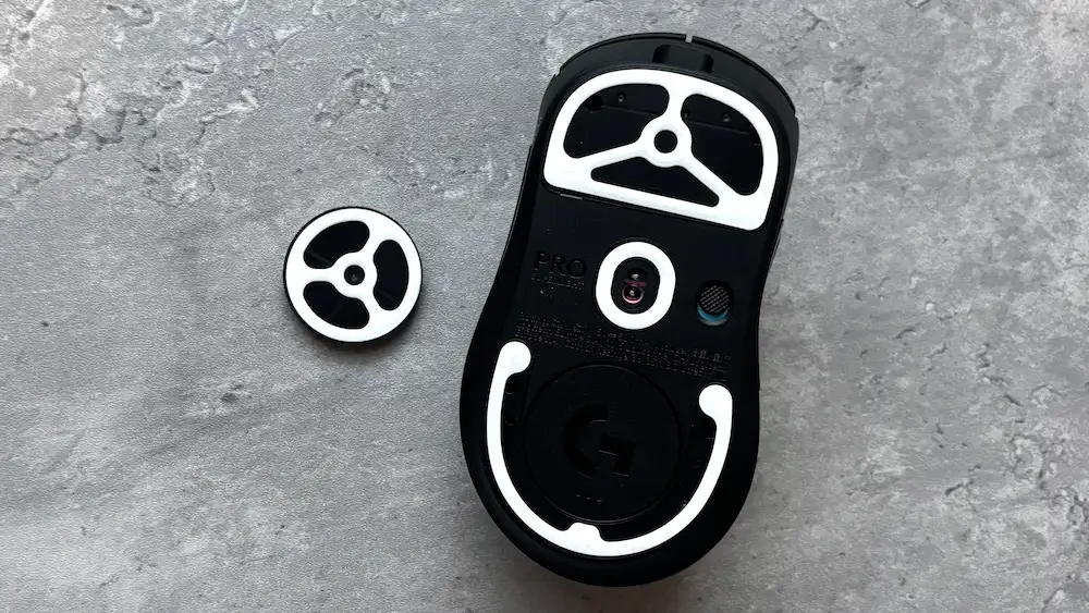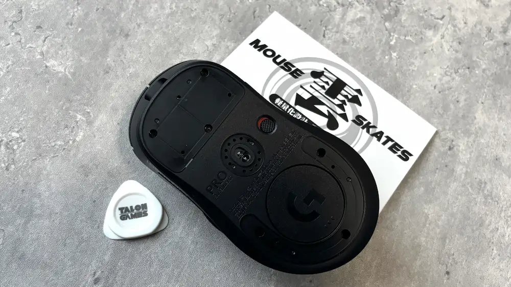 既存のマウスソールは付属のピックで剥がしましょう。完全に剥がさないと、センサーに影響を与える可能性があるので、付属のクリーニングシールなども使用して、綺麗に剥がしましょう。