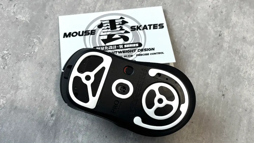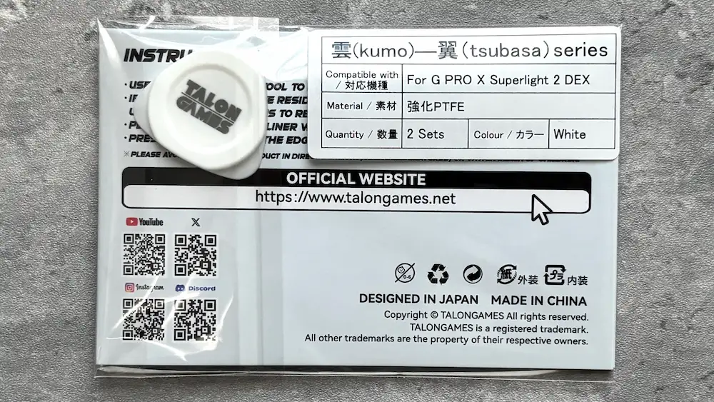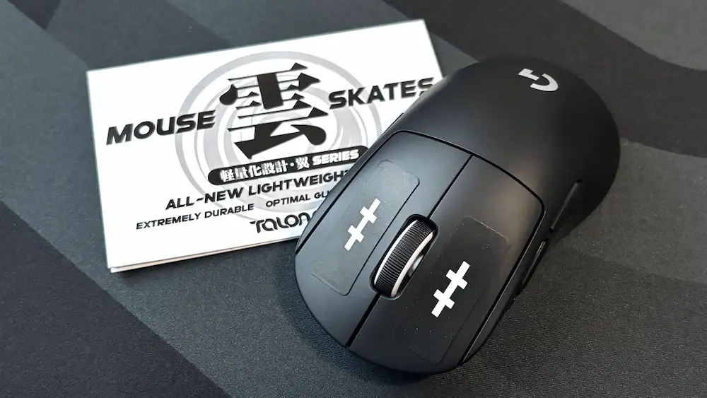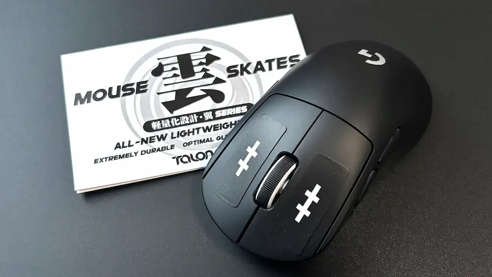 TALONGAMES 雲シリーズ「翼」は強化PTFE素材を採用し、一般的な純PTFEより硬度と耐摩耗性が高いのが特徴です。初動の軽さと低摩擦を保ちつつ、ガラスパッドでも削れにくく静音性にも優れます。ただし硬質な分、布パッドでは引っかかりを感じる場合があります。定番のG640とG-SR-SEで試しましたが、引っ掛かりが感じませんでした。